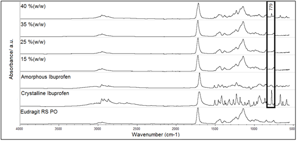 ATR-FTIR spectroscopy was used to assess possible interactions in the hot-melt extruded systems, which could have impact on the solubility, particularly at high drug loadings. Therefore, spectra of Eudragit RS PO, crystalline ibuprofen, amorphous ibuprofen, extruded mixtures of them at different drug loadings are shown in Figure 8.