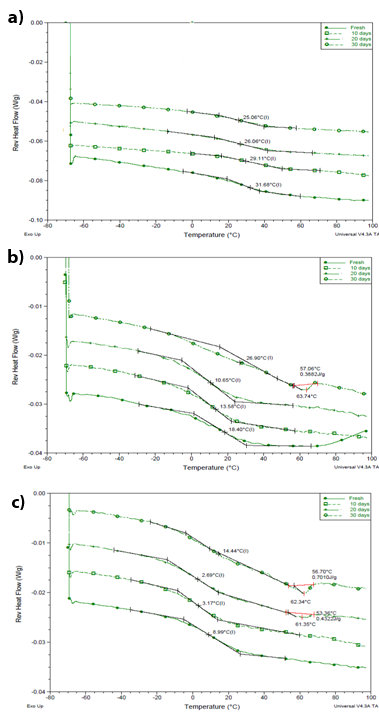 Figure 11 MTDSC reversing heat flow signals of hot melt extruded ibuprofen-Eudragit RS PO systems at (a) 10% (w/w) (b) 20% (w/w) and (c) 30% (w/w) drug loading, examined on 0 day (fresh) and after 10, 20, 30 days of storage at 60% RH/ 25 °C. Single-column fitting.