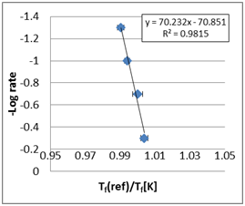 Where βc is the prior cooling rate, Tf is the fictive temperature measured in the heating cycle, Tf,ref is the reference fictive temperature and mΔh is the fragility parameter. The value of Tf,ref may be obtained from the fictive temperature of the cooling rate equivalent to reheating rate used (the limiting fictive temperature).67