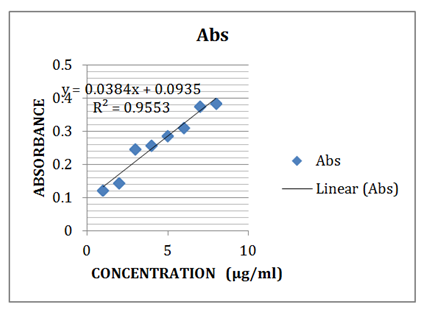 The Thin Layer Chromatography (TLC) result shows both intense yellowish-brown spot and two other dull yellowish-brown spots which could be as a result other types of curcuminoids present in the sample. The Rf values of the yellowish-brown spots are shown in table 5 as compared with the pure Rf value of curcumin (Table 5). The calibration curve from the UV spetrophotometry gives a regression equation of y = 0.038x +0.039 with a correlation coefficient of 0.955 which gives a good indication of linearity. The result also shows that there is reasonable percentage of curcumin in Turmeric (Figure 1 & 2).