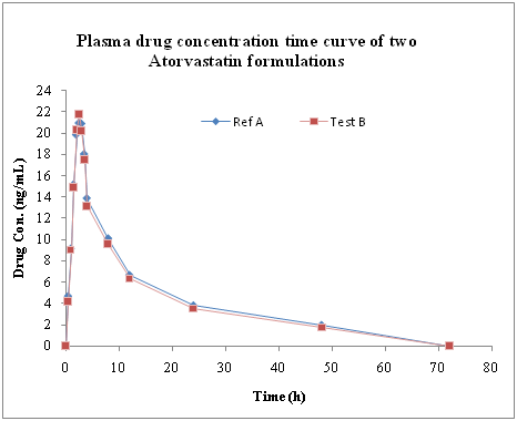 There is an emerging importance of bioequivalence and pharmacokinetics analysis of highly prescribed brand drugs to judge their therapeutic effectiveness, toxicity, and quality to ensure therapeutic validity and patient’s safety. Statin classes of lipid-lowering agents are most commonly used treatment intervention for Non-Communicable Diseases (NCDs) like diabetes, obesity, hypertension, and dyslipidemia.1 Atorvastatin is an FDA approved synthetic lipid reducing agent under statin class. This drug, also known as 2-(4-fluorophenyl) - βR, δR-dihydroxy-5-(1-methyl ethyl)-3-phenyl-4(phenylamino) carbonyl]-1H-pyrrole-1-heptanoic acid (Figure 1), is a second generation 3-hydroxy-3-methylglutaryl-CoA reductase inhibitor.2 This synthetic HMG-CoA reductase inhibitor significantly lowers total cholesterol, low-density lipoprotein cholesterol, and plasma triglycerides in clinical studies.3 According to IMS Health, Lipitor, the pioneer brand of atorvastatin is the world's one of the biggest selling prescription medicines with cumulative sales in excess of $130 billion, but most of the principal brands are now prescribed worldwide as far cheaper generic medicines. In Bangladesh, about 50 atorvastatin brands with different strengths and dosage forms are available and their average sales volume is nearly 1.17 crore taka monthly in the national local market according to Bangladesh Directorate General of Drug Administration (DGDA). This indicates widespread prescribing of this cholesterol-lowering drug in Bangladesh. However, there is no bioequivalence data for any of existing 50 brands of atorvastatin.