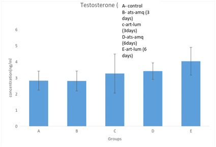 Treatment of male rats with artesunate-amodiaquine (ats-amq) and artemether-lumefantrine (art-lum) for 3 and 6 days caused no statistically significant difference in the serum level of testosterone in the treatment group when compared with the control. Also, the 3 days and 6 days treatment shows no significant difference when compared with each other (Figure 1).