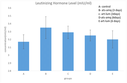 Treatment of male rats with artesunate-amodiaquine (ats-amq) and artemether-lumefantrine (art-lum) for 3 and 6 days caused no statistically significant difference in the serum level of luteinizing hormone in the treatment group when compared with the control. Also, the 3 days and 6 days treatment shows no significant difference when compared with each other (Figure 2).