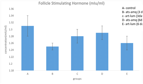 Treatment of male rats with artesunate-amodiaquine (ats-amq) and artemether-lumefantrine (art-lum) for 3 and 6 days caused no statistically significant difference in the serum level of Follicle Stimulating Hormone (FSH) in the treatment group when compared with the control. Also, the 3 days and 6 days treatment shows no significant difference when compared with each other (Figure 3).