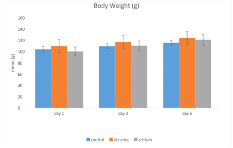 Treatment of male rats with both artesunate-amodiaquine (ats-amq) and artemether-lumefantrine (art-lum) for 3 and 6 days caused no statistically significant difference in the body weight of the treatment group when compared with the control. Also, the 3 days and 6 days treatment shows no significant difference when compared with each other (Figure 4).