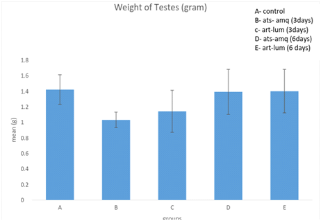 Treatment of male rats with artesunate-amodiaquine (ats-amq) and artemether-lumefantrine (art-lum) for 3 and 6 days caused no statistically significant difference in the testicular weight of the control and treatment groups. Also, the 3 days and 6 days treatment shows no significant difference when compared with each other (Figure 5).