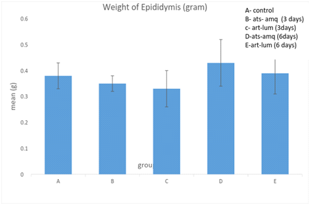 Treatment of male rats with artesunate-amodiaquine (ats-amq) and artemether-lumefantrine (art-lum) for 3 and 6 days caused no statistically significant difference in the epididymal weight of the control and treatment groups. Also, the 3 days and 6 days treatment showed no significant difference when compared with each other (Figure 6).