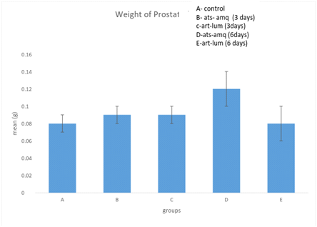 Treatment of male rats with artesunate-amodiaquine (ats-amq) and artemether-lumefantrine (art-lum) for 3 and 6 days caused no statistically significant difference in the weight of prostate of the control and treatment groups. Also, the 3 days and 6 days treatment showed no significant difference when compared with each other (Figure 7).