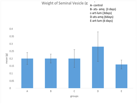 Treatment of male rats with artesunate-amodiaquine (ats-amq) and artemether-lumefantrine (art-lum) for 3 and 6 days causes no statistically significant difference in the weight of seminal vesicle of the control and treatment groups. Also, the 3 days and 6 days treatment shows no significant difference when compared with each other (Figure 8).