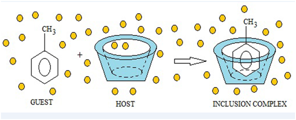 Certain CDs limit its application in pharmaceuticals due to its low solubility and poor safety. One of them includes β-CD which shows low solubility and produces haemolytic activity and strong irritancy. However, some β-CD derivatives can overcome these shortcomings. Nevertheless, owing to its low price β-CD derivatives are widely used in pharmaceutically marketed formulations.23 The solubility of β-CD in water is relatively low (approximately 18.5 54 mg/mL at 25 °C), whereas its derivative hydroxypropyl-β-Cyclodextrin has a higher aqueous solubility (approx. 600 55 mg/mL at 25 °C). Based on published reports, Hydroxypropyl-β-cyclodextrin is widely used derivative of β-CD in improving the solubility of hydrophobic drugs with its better aqueous solubility and higher safety.24 Table 1 represents the natural CDs and its available derivatives. Various reports have been published on β-CD as a host in inclusion complexes with the guest molecules and have been patent. 25,26 Inclusion complex involves stoichiometric molecular phenomenon. CDs as a host forms hydrophilic inclusion complexes (When this cavity is filled with the molecule of another substance, it is called an inclusion complex) with the hydrophobic drug moieties (guest) by incorporating the guest molecule into the internal cavity in the ratio of 1:1 and thereby altering the physicochemical properties of active molecule without any change in the intrinsic properties of active molecule.3,27 Such, changes in the physicochemical properties of the drug molecules such as solubility, dissolution rate, stability and bioavailability28 contributes CDs as an apt candidate for oral drug delivery in the pharmaceutical field. Figure 1 depicts the guest-host inclusion complexes formation. Drug/CD inclusion complexes are usually prepared by simple unit processes such as precipitation, kneading, solvent evaporation, lyophilization and spray drying of solutions or suspensions of the components.29,30 The binding forces of the guest molecule within these inclusion complexes include hydrophobic, van der Waals, hydrogen bonding or dipole interaction.31,32