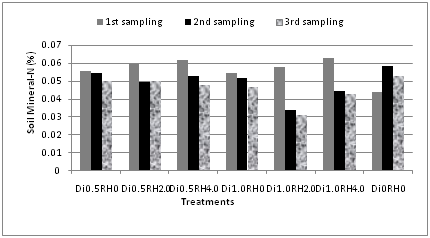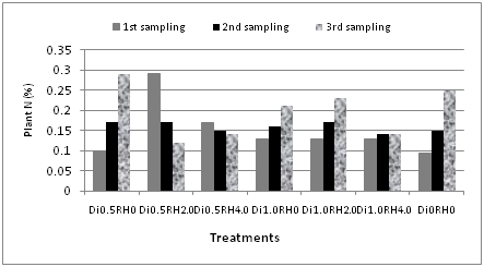 Mineral nitrogen content of the soil varied significantly at three different sampling periods. The highest amount of mineral nitrogen (0.06%) was observed mostly at first sampling period and then the values decreased linearly (Figure 1). In case of control treatment, the mineral content of nitrogen was increased and then decreased. Like the soil, the contents of nitrogen in plants varied significantly at three different sampling periods (Figure 2). The maximum value (0.29%) was observed at both first and third sampling periods. Amount of N decreased significantly at all periods for Di0.5RH2.0 (treatment 2) and Di0.5RH4.0 (treatment 3). However, N was increased linearly for rest of the treatments. This indicated the fact that plant uptake higher amount of nitrogen due to application of double doses of pesticides. Mineral nitrogen of soil and diazinon showed significant correlation (r=0.808) at 5% level in first sampling period. Likewise, diazinon and plant N were significantly correlated (r=0.731) at 5% level in third sampling period.