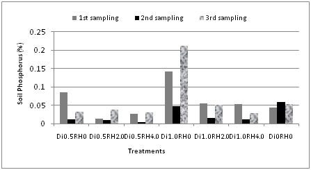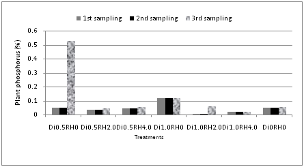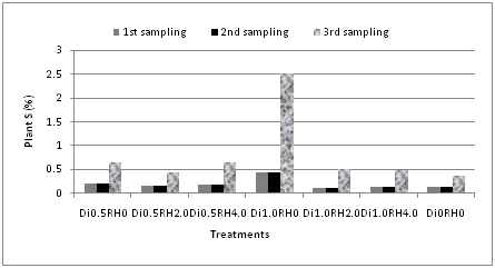 It was observed that phosphorus content of the soil was decreased and then gradually increased at three different sampling periods for all treatments (except the control). The highest amount of phosphorus (0.085%) was found at first sampling period (Figure 3). On the contrary, plant phosphorus contents were varied significantly at three different sampling periods. For most of the treatments including the control, phosphorus contents of the plants (Figure 4) were more or less similar (Di0.5RH0.0-treatment 1, Di1.0RH0.0-treatment 4, treatment 6 and treatment 7). Phosphorus content was increased significantly in case of Di1.0RH2.0 (treatment 5) indicating that plants uptake higher amounts of phosphorus because of double doses of pesticides. The maximum value (0.062%) was observed at third sampling period. P and S in soil showed a strong correlation (r=0.993) at 1% level in third sampling period.