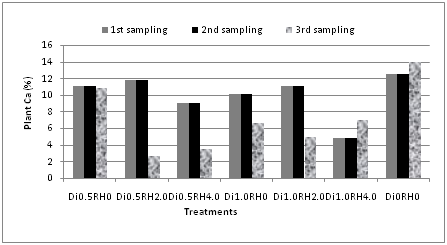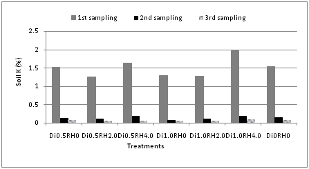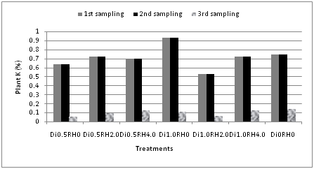 Potassium content of the soil was found to be decreased gradually during all three sampling periods. It was applicable for all the treatments including the control (Figure 5). The content of plant potassium was similar at first and second sampling periods followed by a gradual decrease in third sampling period (Figure 6). The highest amount of potassium was found at first sampling period for both the soil (1.98%) and plant (0.94%). In case of potassium content at different rates of diazinon and rice hull as a bioremediator showed linear behavior at various growth stages of Indian Spinach, which is indicated by the ideal soil conditions for plant growth. K showed a significant correlation with both S (r=0.699) and P (r=0.699) in soil at 5% level in second sampling period. Diazinon and plant K and were significantly correlated (r=0.677) at 5% level in third sampling period.