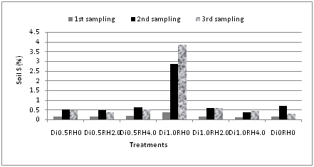 It was found that sulfur content of the soil varied significantly at three different sampling periods for both soil and plant. In case of soil, the sulfur contents were first increased and then decreased for most of the treatments including the control treatment 1, treatment 3, -treatment 4, treatment 5, and treatment 7 (Figure 7). The maximum value (0.69%) was observed at second sampling period. This could be due to the application rate of bioremediant. However, sulfur contents of plants followed a definite trend. The content was same in the first and second sampling period followed by an increase in third sampling period (Figure 8). The highest value (2.52%) was found in third sampling period for Di1.0RH2.0 (treatment 5). P and S in soil showed a significant correlation (r=0.790) at 5% level in first sampling period. Similarly, in the second sampling period, both of them were strongly correlated (r=0.961) at 1% level of significance.