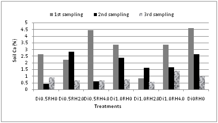 At the first sampling time in all cases, the calcium content was higher than other two for both soil and plant except treatment 5 and treatment 6 due to the different application rate of rice hull but some rate of diazinon. In case of control, Ca content was decreased for soil and vice versa for plant (Figure 9 & 10). The highest value was found at first and third sampling period for soil (4.62%) and plant (14%) respectively. Ca and K in soil showed strong correlation (r=0.859) at 1% level for third sampling period.