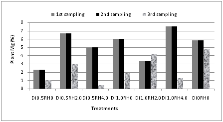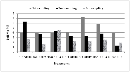 The contents of magnesium varied significantly at all different sampling periods for both soil and plant. It was found that magnesium content in soil was highest at first sampling time for all treatments except treatment 1 and treatment 3 because of the same rate of diazinon but different rate of rice hull application (Figure 11). For plant, the Mg content showed linear relation except treatment 5 (Figure 12). The highest value was found at first sampling period for both soils (7.39%) and plant (2.518%). Mg and Ca in soil showed a significant correlation (r=0.671) at 5% level in first sampling period. However, Mg in plant and diazinon was strongly correlated (r=0.850) at 1% level for second sampling period. The results showed that, mineral N was decreased for soil but increased for the plant samples. The mineral N content was highest in case of first sampling period and then it decreased as the pesticide and rice hull degraded. Rice hull restricted diazinon to persist in soil which helped to increased nitrogen uptake by plants. Other nutrient elements viz., P, K, Ca and Mg were decreased gradually for both soil and plant. However, the scenario was quite different for S. The highest content of S was found in third sampling period. S degrades and becomes more available to plants as it is present in diazinon structure.