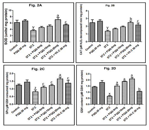 Ameliorating percent (%) were calculated as compared to the PQQ (20mg) and Vit. C (50mg) treated group to STZ-induced diabetic group animals.