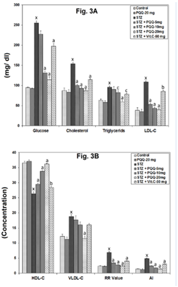 With respect to different serum parameters, a significant (p < 0.001) increase in the level of glucose, total cholesterol and triglyceride (Figure 3A); LDL-C, VLDL-C, RR ratio and AI (Figure 3B) was observed following the STZ administration. However, when PQQ (5, 10 and 20mg/kg/d) was administered in the diabetic animals; out of three doses of PQQ, 20mg/ kg markedly reversed all these indices and the reversal percentages were also found to be better as compared to other two doses. While, on administration of Vit. C (50mg/kg) to STZ-treated animals, it significantly reversed the aforesaid indices as compared to that of STZ-induced diabetic animals, except VLDL-C where no significant alterations was observed; With respect to serum HDL-C level, it was decreased significantly (p < 0.001) following the STZ administration, and on PQQ (5, 10 and 20mg/kg/d) administration in the diabetic animals, a significant (p < 0.001) increase was observed with all 3 tested doses. On administration of Vit. C (50mg/kg) to STZ-treated animals, it also significantly (p < 0.01) increased the HDL-C level (Figure 3B).