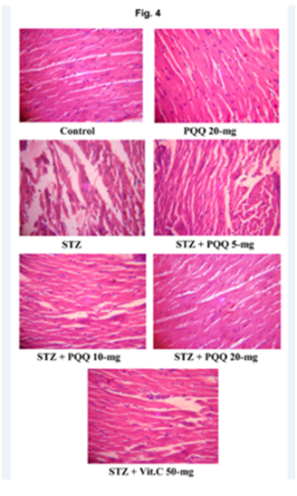 With respect to histopathological observations of heart; the control group animals showed normal morphological and cyto-architecture of the myocardium, but in STZ-treated mice, the necrotic changes, disruption of myofibrils, vacuolization of the cytoplasm, patchy necrosis and inflammatory cells were observed in myocardial tissues. However, administration of PQQ (5, 10 & 20mg/kg) to STZ treated mice ameliorated these deleterious effects in a dose dependent manner. The histology of heart tissues of PQQ treated animals showed moderate loss of myofibrils and vacuolization of the cytoplasm as well as showed regenerative changes in myocardial tissue. PQQ treatment in diabetic animals provided optimal protection at a dose of 20mg/kg body weight, suggesting the protective action of PQQ against oxidative stress-mediated cardiac damage. Similar beneficial effects were observed after administration of Vit. C to STZ treated animals. No significant histological changes were observed by the administration of PQQ (20mg/kg) to normoglycemic animals (Figure 4). When we comparing the effects of PQQ (20mg) and Vit. C (50mg) in STZ-induced diabetic animals, interestingly better ameliorating effects were observed in PQQ than Vit. C to ameliorates diabetes-induced cardiovascular problems (Table 2).