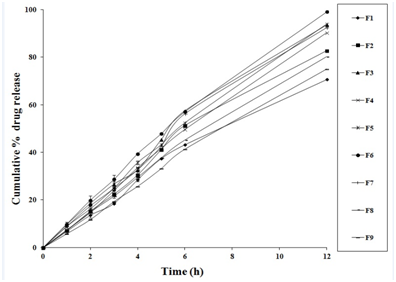 The cumulative percentage of drug permeated from the film of different formulations is shown in (Figure 1). PVA:PVP transdermal films showed good in drug release when compared to ethyl cellulose and eudragit formulations. The percentage release was found to be highest (99.12±0.96%) for formulation carrying PVA: PVP in ratio 1:4 when compared to other formulations.