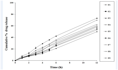 From the film evaluation, the values of % swellability, water vapour transmission, moisture uptake and % moisture content of all formulations were in the acceptable range. The study of hydration of polymers is an important finding that regulates the drug release from controlled/sustained release matrix. The result of water uptake by the polymer causes empty spaces within the film that could decrease its mechanical integrity and becomes structure less. The effect of hydration and water uptake is more common in hydrophilic polymers, so films containing higher amount of PVP showed good water vapour transmission than that of eudragit and ethyl cellulose films. PVP films showed the more water vapour permeation as a result of the irregular arrangement of molecules in the amorphous state, which causes the molecules to be spaced further apart than in crystal. From the moisture content studies, all the formulations showed below 5% moisture content and moisture uptake. Similar type of results was observed in a study developed by Fatima et al.11 As the moisture content of the prepared formulations was low, that results the more stable formulations with reduced brittleness, bulkiness and microbial contamination during long term storage.22