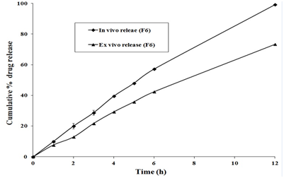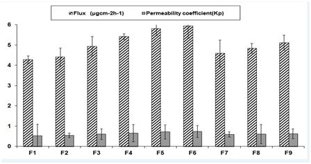 The Ex vivo permeation studies were conducted for all formulations. The cumulative amount permeated was calculated and presented in (Figure 2). The cumulative percent drug permeation was higher in case of PVA-PVP polymer containing matrix i.e. 73.28±0.92%. The comparison between in vitro and ex vivo release from F6 formulation was given in (Figure 3). The permeability coefficients were found in the range of 0.528 to 0.748. The calculated flux and permeability coefficients of all formulations were shown in (Figure 4).