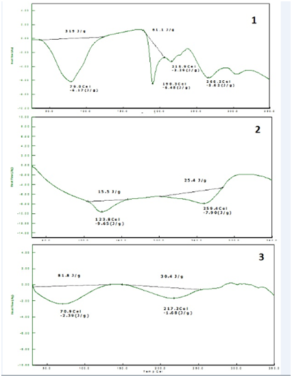 DSC thermograms of plain drug, formulation and placebo film were shown in (Figure 5). The characteristic peaks of pattern followed the same path as that of the drug alone with minor difference due to dilution effect.