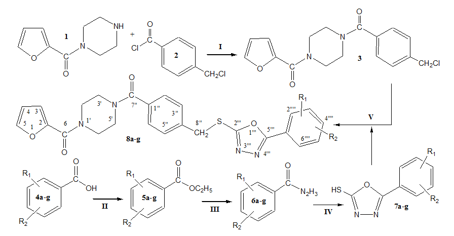 In the present investigation, various novel tri-heterocyclic benzamides were synthesized by the nucleophilic substitution reaction of 2-furoyl-(1-piperazinyl)methanone (1) with 4-(chloromethyl)benzoyl chloride (2) in a basic aqueous medium to get an electrophile {4-[4-(chloromethyl)benzoyl]-1-piperazinyl}(2-furyl) methanone (3). In parallel set of reactions, various substituted-benzoic acids (4a-g) were refluxed with ethanol and conc. sulphuric acid to form respective ethyl substituted-benzoates (5a-g). These esters were further refluxed with N2H4.H2O in methanol solution to acquire substituted-benzohydrazides (6a-g). These hydrazides were cyclized into heterocyclic core by refluxing with CS2 in the presence of KOH and ethanol solvent, giving rise to the formation of various 5-(substituted-phenyl)-1,3,4-oxadiazol-2-thiols (7a-g). The final step in the synthesis was the coupling of electrophile, 3, with nucelophiles, 7a-g, in acetonitrile and potassium carbonate to yield the targeted tri-heterocyclic molecules, 8a-g. Structures of these novel compounds were characterized and confirmed by IR, 1H-NMR, 13C-NMR and EI-MS techniques. (Figure 1) (Table 1).