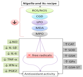 A number of in vitro and in vivo antioxidant studies have been conducted with N. sativa extracts, seed oil and TQ. The finding is suggesting having potential radical scavenging and inhibitory effects of oxidative stress. TQ effectively changed the parameters including adenosine deaminase (ADA), catalase (CAT), myloperoxidase (MPO), lipid peroxidase (LPO), reduced glutathione (GSH), glutathione-S-transferase (GSH-ST), glutathione peroxidase (GPx), superoxide dismutase (SOD) and nitric oxide (NO). It also reduced the malonilealdehyde (MDA), conjugated diene (CGD) levels and pro-inflammatory mediators interleukin-1beta (IL-1β), interleukin-6 (IL-6), tumor necrosis factor-alpha (TNF-α), interferon-gamma (IFN-γ), and prostaglandin (PGE2) rather than interleukin-10 (IL-10) [1,4]. Figure 2 tells the basic antioxidant pathways of Nigella and its constitution.