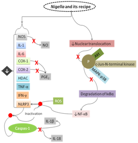 Findings from different animal models suggest that N. sativa extracts, seed oil and TQ have anti-inflammatory potentials. This activity belongs to the reduction of NO production, interleukin-1 (IL-1), cyclooxygenase-1 (COX-1), cyclooxygenase-2 (COX-2), histone deacetylase (HDAC) along with other pro-inflammatory mediators such as - IL-1β, IL-6, TNF-α, IFN-γ, and PGE2 [2]. Topical application of TQ induced the expression of hemeoxygenase-1, NAD(P)H-quinoneoxidoreductase-1, GSH-ST and glutamate cysteine ligase in mice; while the seed oil inhibited COXs, 5-LPO in the pathways of arachidonate metabolism in rats [3]. TQ was also shown to diminish nuclear translocation and the DNA binding of nuclear factor-kappa-B (NF-κB) via the blockade of phosphorylation and subsequent degradation of IκBα in mice. TQ also attenuated the phosphorylation of Akt (protein kinase B), c-Jun-N-terminal kinase (c-JUNK) and p38 mitogen-activated protein kinase (MAPK-p38). A decrease in expression of NLRP3 (NACHT, LRR, and pyrin domain-containing protein 3) in B16F10 mouse resulted in inactivation of caspase-1 followed by the inhibition of IL-1β and IL-18. In addition, the inhibitory effect of TQ to NF-κB and reactive oxygen species (ROS) resulted in the partial inactivation of NLRP3 inflammasome [3-5]. Figure 3 tells the basic anti-inflammatory activity pathways of Nigella and its constitution.