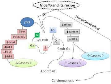 The black seed oil is an enhancer of the NK cells, which is a potential applicability in immune therapy. However, the components in oil may induce antioxidative-induced prooxidant effects thus the carcinogenetic effect. In addition, TQ tested in a number cancer cells derived from mice, suggesting its ability to arrest G0/G1 phases of cell-cycle, which correlated with sharp increases in the expression of the cyclin-dependent kinase p16 (CDK-p16) and a decrease in cyclin-d1 (dcl-1) protein expression in papiloma (SP-1) cell line and G2/M arrest associated with an increase in the expression of the tumor suppressor protein p53 with a decreased level of cyclin-b1 (bcl-1) protein. The chemopreventive potential of TQ may be due to its ability to increase the ratio of apoptosis regulator (bcl-4)/cyclin-2 (bax/bcl-2) expression and decreasing cyclin-xl (bcl-xl) protein. The antitumor activity of TQ was also reported in squamous cell carcinoma (SCC-VII), FsaR and murine tumor models of fibrosarcoma and SCC. TQ showed potent anticancer activity in A431 and Hep-2 cells via apoptosis by increasing the sub-G1 population, live/dead cytotoxicity, chromatin condensation, DNA laddering and Tunel-positive cells. Along with an increase in bax/bcl-2 ratio activation of cell proliferation of caspases and cleavage of poly ADP ribose polymerase were observed [3]. A research done by Khalife et al. [13] suggesting that TQ induced apoptosis through p53-independent pathway with an expression of p21 and arrested cell-cycle S phase in human colon cancer cells. TQ is also anticancer agent to a number of cell lines including MCF-7/Topo breast carcinoma cells and is a significant down-regulator of NF-κB and MMP-9 in Panc-1 cells and bcl-2 in gastric cancer cells, while up-regulator of caspase-3 and caspase-9 in the later one. A number of derivatives of TQ namely 6-menthoxybutyryl, 6-hencosahexanyl conjugate, 4-acylhydrazones and 6-alkyl derivatives are also evident to produce anticancer activity in cancer cell lines [1]. Recent evidence suggests that the nanoemulsion of Nigella oil at a dose of 20-80µL/mL caused cell membrane blebbing, cytoplasmic vacuolation, marginalization of chromatin, and fragmentation of the nucleus in MCF-7 cells [14]. A recent evidence suggests that topical use of black seed oil (600mg) reduced cyclic mastalgia in woman (n=52) and the activity is significantly comparable to the painkiller, diclofenac [15]. A basic Nigella-anticancer potential has been sketched in Figure 4.