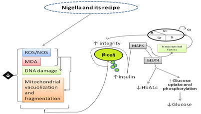 N. sativa was found playing an important role in the reduction of blood glucose level with an augmenting insulin level and C-peptide in rats. TQ reduces the tissue MDA levels, DNA damage, mitochondrial vacuolization and fragmentation, and preserves pancreatic β-cell integrity via antioxidant capacity. In a study TQ is evident to increase the levels of insulin, Hb with a significant decrease in glucose and glycosylated hemoglobin (HbA1c) levels. N. sativa showed a synergistic activity with parathyroid hormone in improving bone mass, connectivity, biomechanical behavior and strength in T2D rats. The black seeds are also evident an advantageous therapy in insulin resistance syndrome and dislipidemic patients. An insulin-sensitization action via enhancing ACC phosphorylation (mainly MAPK signaling pathway) and muscle GLUT4 content as well as progressive normalization of glycaemia are also seen in N. sativa treated diabetic Meriones shawi [2,6]. Lipid (4%) and volatile (3%) fractions in streptozotocin-induced diabetes mellitus (DM) rats reduced toxicological and adverse consequences to the animals [16]. In addition, an improved glycemic status and lipid profile with oil treatment at 3g/3-times/day in DM patients (n=72) were suggested by Heshmati et al. [17]. TQ when tested in clonal β-cells and rodent islets it caused a protective effect with normalization of chronic accumulation of malonyl CoA, and elevation of acetyl CoA carboxylase (ACC), fatty acid synthase (FAS) and fatty acid binding proteins (FABPs) following chronic glucose overload, suggesting a modulation in β-cell redox circuitry and enhancing sensitivity of β-cell metabolic pathways to glucose and glucose-stimulated insulin secretion (GSIS) under both normal conditions and hyperglycemia [18]. Otherwise, MAPK regulates a number of transcriptional factors, altering of which interferes in cell-cycle. Thus, N. sativa and TQ may be a good remedy for both type 1 and 2 DM patients, as in this consequence maintenance of beta-cell integrity and secretion of insulin sufficient for glycogenesis and phosphorylation of raised glucose in blood are crucial. Otherwise, along with ingested food, oxidative stress, infection and trauma are the factors that increase in blood sugar levels. Thus, the antidiabetic activity of N. sativa and TQ may connect with their antioxidant, antimicrobial, cytotoxic and anti-inflammatory activities. Otherwise, the decreasing level of HbA1c is one of the remedy for cardiovascular disease, nephropathy, neuropathy, and retinopathy. Figure 5 tells the possible antidiabetic actiion pathways of Nigella and its constitution.