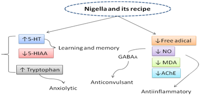 Methanolic extract of N. sativa is a potent analgesic and antidepressant. In addition, an anxiolytic activity via increasing serotonin (5-HT) and decreasing hydroxyindole acetic acid (5-HIAA) levels were noticed in rat brain. An increased 5-HT secretion along with improving learning and memory capacity were detected in rats. As it caused an augment in tryptophan levels, it may be helpful in anxiety treatment. Otherwise, TQ produced GABA-mediated anxiolytic-like effect in mice with a decline of NO and MDA production [2]. The possible neuroprotective activity may be due to its antioxidant, free radical scavenging and anti-inflammatory capacities. Along with these phenomena anti-acetylcholinesterase (anti-AChE) suggests N. sativa and TQ having anticonvulsant activity. There is a suggestion for GABAA-ergic anticonvulsant effect of TQ [2]. Nigella EO at 1g/kg (i.g.)/ day and TQ 30 at mg/kg/day (i.p.) in Wistar albino rats produced anti-nitrosative effects after a 10 days treatment [22]. Nigella EO is also evident to prevent cerebral edema in the hippocampus tissue of the rat brain [23]. Fahmy et al. [24] suggested that oil at a dose of 2.8g/kg when treated orally (p.o.) in autoimmune encephalomyelitis rats for 4 weeks reduced oxidative stress parameters in the cortex and hippocampus as well as enhanced remyelination in the hippocampus. Otherwise, oil at a dose of 4mL/kg/day (p.o.) in tramadol treated male albino rats protected the cortical neurons and myelinated axons [25]. Nigella EO at 500mg in adolescent human males (n=48) stabilized mood, decrease anxiety and modulate cognition for a 4 weeks treatment [26]. A possible neuroprotectivity and activity on NS is shown in Figure 6.