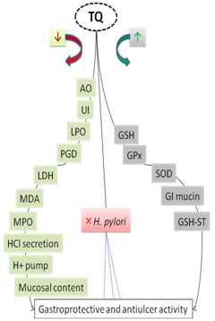 TQ is gastroprotective as it decreases gastric acid secretion, acid output (AO), pepsin, the mucosal content/activity of lipid peroxidase (LPO), proton (H+) pump, MPO and ulcer index (UI) while an increased in the content/activity of gastric mucin, GSH, total nitric oxide (TNO) and SOD. Decreased ulcer severity in rats was guessed via prostaglandin (PGD)-mediated and/or through antioxidant and antisecretion pathways. A decreased LPO and lactate dehydroginase (LDH), MPO, MDA and increased GSH, SOD, GPx, GSH-ST without altering of gastric CAT was also reported in rats. TQ was found significant effects in diarrhea, colitis, inflammatory bowel diseases, anti-Helicobacter pylori and body weight loss [1]. Possible GIT protective pathways of Nigella and its constitution are shown in Figure 7.