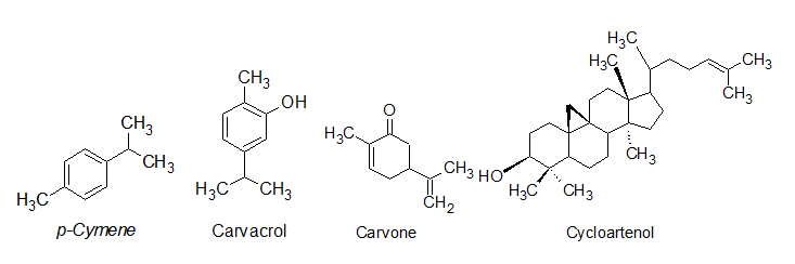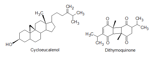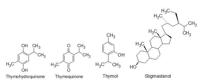 The seed contains alkaloids that isoquinoline alkaloids (e.g. - nigellicimine, nigellicimine N-oxide), pyrazole alkaloids or imidazole ring bearing alkaloids (e.g. - nigellidine, nigellicine). It also contains terpenes (e.g. - α-hederin) and saponins. Evidences tell that thymoquinone (2-Isopropyl-5-methylbenzo-1,4-quinone, 30-48%), thymohydroquinone, dithymoquinone, p-cymene (7-15%), carvacrol (6-12%), 4-terpineol (2-7%), t-anethol (1-4%), sesquiterpene longifolene (1-8%), α-pinene and thymol etc. are the most important active components in N. sativa. The other chemical components are carvone, nigellicine [1], nigellone, citrostradienol, cycloeucalenol, gramisterol, lophenol, ostusifoliol, stigmastanol, β-amyrin, butyrospermol, cycloartenol, 24-methylene-cycloartanol, taraxerol, tirucallol, 3-O-[β-D-xylopyranosyl(1→3)-α-L-arabino-pyranosyl]-28-O-[α-L-rhamnopyranosyl(1→4)-β-D-glucopyranosyl(1→6)-β-D-glucopyranosyl] hederagenin, esters of unsaturated fatty acids with ≥ C15 terpenoids, esters of dehydrostearic and linoleic acid, aliphatic alcohol, β-unsaturated hydroxyl ketone, hederagenin glycoside, melanthin, melanthigenin, bitter principle, tannin, resin, reducing sugars, glycosidal saponin, 3-O-[β-D-xylopyranosyl(1→2)-α-L-rhamnopyrasyl(1→2)-β-D-glucopyranosyl]-11-methoxy-16, 23-dihydroxy-28-methylolean-12-enoate,stigma-5,22-dien-3-β-D-glucopyranoside,cycloart-23-methyl-7,20,22-triene-3β,25-diol, nigellidine-4-O-sulfite, N. mines A3, a4, A5, C, N. mines A1, a2, B1, and B2 [2]. Chemical structures of some important chemical moieties are shown in Figure 1.