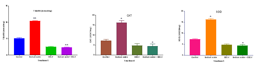 The amount of total flavonoid was determined the Quercetin reagent. Quercetin was used as a standard compound and the total flavonoid were expressed as mg/g Quercetin equivalent using the standard curve equation: y = 0.119 x, R2= 0.998, Where y is absorbance at 510nm and x is total flavonoid content in the extracts. The total flavonoid content measured by AlCl3 reagent in terms of Quercetin acid equivalent was found to be 42.6 ± 0.23mg/g. Antioxidant properties of various natural products are assayed using a stressor that causes injury or cell death. Hence, in the present study, sodium azide treatment was used as an in vitro experimental model for oxidative damage. Sodium azide acts by inhibiting complex IV (cytochrome oxidase) in the electron transport chain leading to hypoxia, by inhibiting the formation of adenosine triphosphate (ATP), and promoting an increase in reactive species, including superoxide anion and hydrogen peroxide, which may cause oxidative stress and cell death. TBARS is used to evaluate lipid and protein damage. Table 1 demonstrates that sodium azide increased TBARS. EELV prevented the increase in TBARS. These results are in conformity with the observations of Souza et al.13 The enzymatic antioxidant defenses (CAT and SOD) were evaluated, in view of the fact that they are the most important enzymes of the antioxidant defense. These enzymes represent the first barrier against reactive species and are vital for cell survival. The enzyme SOD catalyzes the dismutation of superoxide anion into oxygen and hydrogen peroxide. The enzyme CAT catalyzes the reduction of hydrogen peroxide to water and molecular oxygen. In the present study, it was established that sodium azide increased CAT activity (Table 1) and reduced SOD activity in rat hippocampal homogenate, and that these alterations were prevented by EELV. Similar observations are reported by Souza et al.13