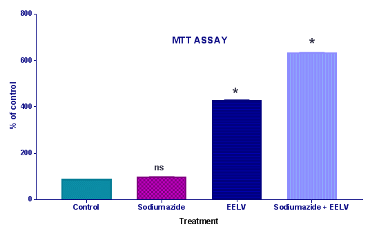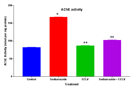 Further, the treatment with sodium azide impaired the learning and memory and increases the levels of brain AChE.14 Effect of EELV on brain AChE level in sodium azide treated rats showed a significant rise in brain AChE activity in comparison to control animals. Administration of EELV to sodium azide treated rats showed a significant decline in brain AChE activity in comparison to sodium azide treated control group animals. Sodium azide induced Oxidative damage might lead to neural cell death. MTT assay was used to evaluate the effect of sodium azide and EELV on the viability of the homogenates. In the present study sodium azide did not alter MTT reduction levels in the rat hippocampal homogenate. However, EELV augmented MTT reduction in the presence or absence of sodium azide, demonstrating that the extract enhanced cell viability and showed some beneficial effect against cell death. Furthermore, sodium azide significantly compromises the non-enzymatic (sulfhydryl) and enzymatic (CAT and SOD) antioxidant defenses; thus increasing the levels of reactive species, although it did not induce cell death in the rat hippocampal homogenate. Hence, there was an imbalance between pro-oxidants and antioxidants leading to oxidative stress. Additionally, EELV also prevented the oxidative damage induced by sodium azide.