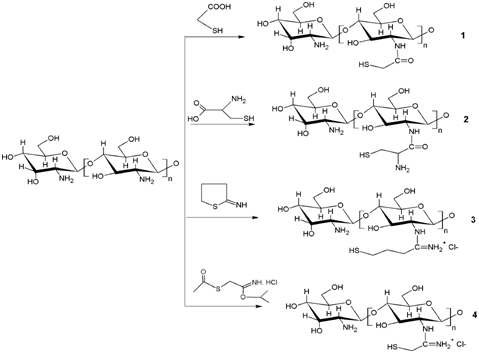 Chitosan (CS), a cationic polysaccharide, has been widely used in ophthalmic therapy1 obtained naturally by alkali deacetylation of chitin and various industrial sources i.e. lobster and crab, shell wastes of shrimp etc.15,16 The primary amino groups of chitosan can be easily modified chemically i.e., salt formation with acids. CS is insoluble in alkaline and neutral pH17,18 but the amino group can be easily protonated at acidic pH leading to increase in solubility. Moreover, favorable enzymatic biodegradability, non-toxicity and biocompatibility CS leads to a considerable attention by the scientists for its favorable use as a novel excipients for the drug delivery systems and thus, since 2002 it was included in European Pharmacopoeia.19 Furthermore, CS has penetration-enhancing properties and thus, has attracted significant attention as being a potential absorption enhancer for transport across the mucosal epithelia. Because of poor aqueous solubility of CS at pH above 6 limits its effectiveness at the site of drug absorption. Above pH 6, CS loses its positive-charge density, and induces the formation of aggregates and precipitates.20 This problem can be overcome by the use of thiolated chitosan (TCS), comprising a new generation of mucoadhesive polymers-thiolated polymers or thiomers.21