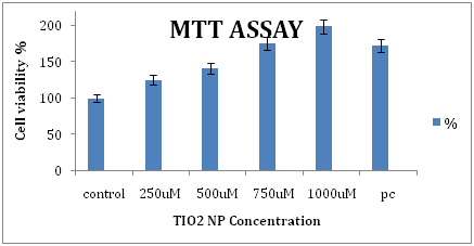 MTT assay was done according to method of Mosmann.22 Cells (10,000/well in 100μl medium) were seeded in 96 well plate and allowed to adhere overnight. Medium was aspirated and cells were incubated with TiO2 NPs (250, 500, 750 and 1000μM) at 37 °C for 24h, respectively and for 3h with MTT dye (5mg /10ml pbs). The reaction mixture was carefully aspirated and the resulting formazan crystals were solubilized by adding 100μl dimethylsulphoxide. After 10min, absorbance was read at 570nm in a SYNERGY-HT multiwell plate reader, Bio-Tek (USA) using KC4 software.