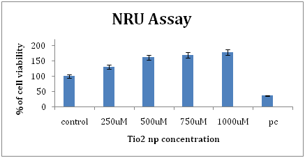 NRU assay was done according to method of Mosmann.22 Cells (10,000/well in 100μl medium) were seeded in 96 well plate and allowed to adhere overnight. Medium was aspirated and cells were incubated with TiO2 NPs (250, 500, 750 and 1000μM) at 37°C for 24h, respectively and for 2h with NRU dye (4mg/ 10ml in PBS). The reaction mixture was carefully aspirated and the cells were destained by adding 150μl destaining solution. Absorbance was read at 540nm in a SYNERGY-HT multiwell plate reader, Bio-Tek (USA) using KC4 software.