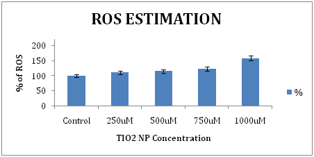 ROS generation plays a key role in toxicity of NPs in mammalian cells.28 ROS is an important factor in the apoptotic process. Excessive generation of ROS induces mitochondrial membrane permeability and damages the respiratory chain to trigger the apoptotic process.29 Figure 3 shows an increase in % ROS generation in WRL-68 cells on treatment with increase in concentration of TiO2 NPs in WRL-68 cells. The result indicated that when the cells were incubated with the different concentrations of nano-TiO2, oxidative stress was occurred in response to the treatment of the nano-TiO2, and the contents of the ROS was increased significantly. We thus confirmed that exposure to ROS generated by TiO2 NPs is significantly associated with catalase down regulation and methylation of the catalase promoter in WRL-68 cell. The WRL-68 cells were exposed at concentration 250μM, 500μM, 750μM, 1000μM of TiO2 NPs for 24h.
