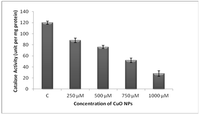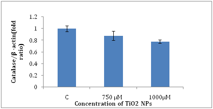 The Catalase activity was measured using cell lysates of the cells. The WRL-68 cells were exposed at concentration 250μM, 500μM, 750μM, 1000μM of TiO2 NPs for 24h. Experiments were performed in triplicate and data expressed as the mean of three independent experiments.
