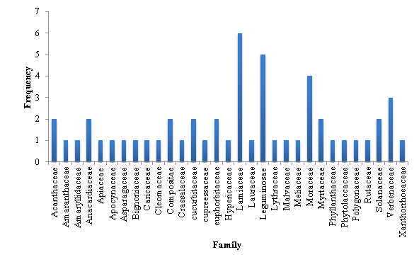 A total of 52 plants species used in the management of HIV/AIDS opportunistic infections belonging to 49 genera and 31 families were identified. The families Lamiaceae and Leguminosae had the highest number of species recorded each having 6 and 5 plant species 9 respectively, followed by Moraceae and Verbanaceae in that order (Figure 2)(Table 2). Lamiaceae was used by traditional healers to manage HIV/AIDS infections; including urinary tract, wounds, kidney infection and stomach ache, members of this family contain terpenoids. Terpenoids are biological compounds that can enhance and maintain the body immunity.5