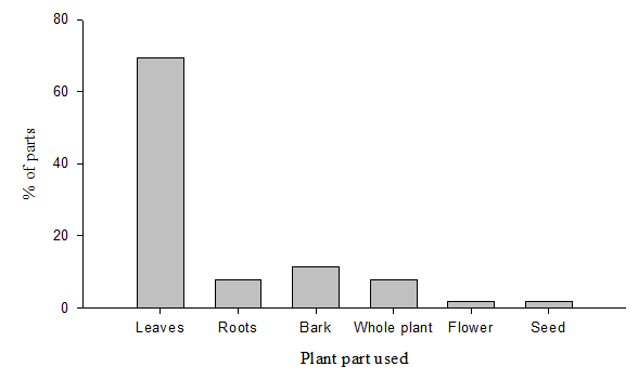 Most of the plants used were trees and herbs (Figure 3). The most frequently used plant was Albizia coriaria, Callistemon citrinus, Pseodospondias microcarpa, Spathodea campanulata, Psorospermum febrifugue, Solestenostemon latifolius, Tetradenia riparia and Erythrina abyssinica. Thirty four (34) plant species were used to manage more than one condition, with Cupressus lusitanica, Persea americana, and Punica granatum as the only species used to manage more than two HIV opportunistic infections. The most commonly used part of the medicinal plant was leaves, followed by bark and roots in that order (Figure 3). Leaves are commonly used because they have a higher content of bioactive compounds that treats the infection.25,2 The utilization of leaves in local medications inflicting less damaged to the medicinal plants and is advantageous as far as conservation is concerned.