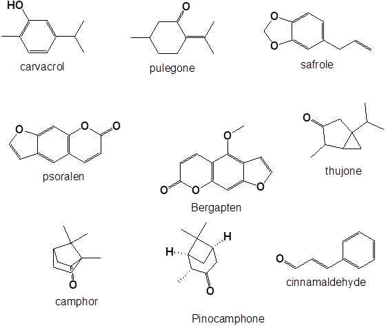 EOs in the form of natural preservatives are generally recognized as safe (GRAS) as recommended by the FDA and allowed their permitted use.19 Figure 1 demonstrates some of the components of EOs with toxicity.1,8 Since these EOs are required to use in higher concentrations, the issues related to their toxicity cannot be ignored. Presently applied toxicity and safety evaluations are available with different variables for EOs. One of the most used methods for evaluating EOs safety and toxicity is the acute oral test in which LD50 or Median Lethal Dose value is determined.20 In various reported works done in animal models, the acceptable range of EOs and their chemical components with LD50 is 1-20 g/kg body weight.8,19 These evaluations are needed because of the side effects reported in recent years such as oestrogenic, carcinogenic, and abortifacient effects.21 EOs derived from Salvia lavandifula, Mentha pulegium, Satureja hortensis, Chenopodium, and Thuja were found to have significant toxic effects with LD50 value ranges between 0.1-1 g/kg in the animal model (rats) and requires prescribed precautions before their use.8,21