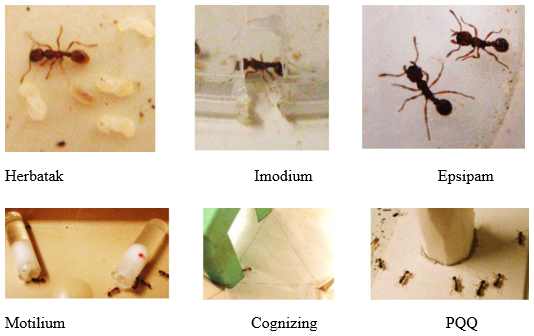 Figure 1 For each product, a photo of one of their side effects, except for PQQ, the photo being that of a wanted effect. Of course, each product had many other not illustrated effects reported in the text. Herbatak: decreased the ants’ brood caring; Imodium: decreased the ants’ ability to escape from an enclosure, so their cognition; Epsipam: induced some aggressiveness towards congeners, impacting thus the social relationships; Motilium: leaded to dependence on its consumption (the tube with a red dot contained the drug); Cognizing: did not affect the ants’ conditioning acquisition; the ant duly responded to the learned green cube; PGG: increased the number of ants coming onto an unknown apparatus, and thus their activity and audacity.