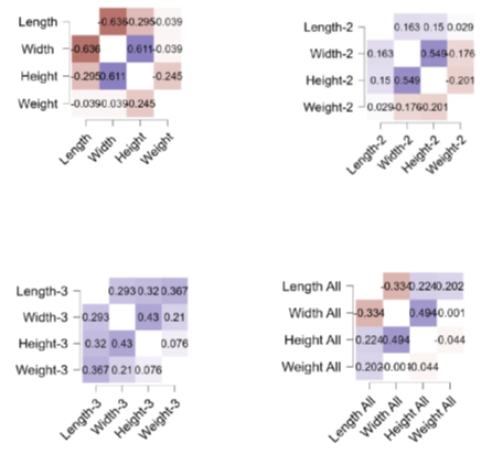 In Group 3 (N=329), the regression results indicated that shell length (β = 0.323) was the strongest positive predictor of shell weight, while shell width (β = 0.090) had a weak but positive influence. In contrast, shell height (β = -0.114) showed a slight negative contribution. These findings highlight the dominant role of shell length in determining shell weight, with minimal contributions from shell width and height. For the combined group (N=1100), the regression analysis showed that shell length (β = 0.111) and shell width (β = 0.067) had positive and significant contributions to shell weight, whereas shell height (β = -0.180) exhibited a significant negative relationship. These results indicate that shell weight is primarily influenced by the size parameters of length and width, while the negative contribution of height suggests a potential compensatory effect on overall weight.