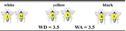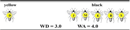 For a better understanding of the weighting criteria, we are going to analyze how the species are organized within the studied group and the respective values of WD and WA. In Figure 1 we analyze the character ‘color of the pronotum’ that presents a maximum degree of discrimination. This happens when the status number of the character is equal to the number of species that make up the analyzed group. These characters are suitable for studies aimed at the individualization of taxonomic units. In Figure 2 we will analyze the ‘propodium punctuation’. This character has the smallest grouping of species that a variable character can form: 2 subgroups of equal size brought together by 2 different statuses. Thus, we observed that the weight of the aggregation potential reaches the maximum value (WA = 6 .0) while the weight of discrimination reaches. The Figure 3 shows a situation in which the character ‘color of the labrum’ can aggregate and discriminate minimum value (WD = 1 .0). Characters with these qualities are suitable for cladistic studies, as they can form larger groups from the gathering of similar smaller groups in a similar way, forming homogeneous subgroups that differ from each other. When the WD and WA values are close, the characters are classified as intermediate (or moderate) and sometimes the WD and WA values are exactly the same as shown in Figure 3. In Figure 4 we analyze the taxonomic character ‘color of the scapum’ in which the aggregative potential (WA = 4.0) is greater than the discriminative potential (WD = 3.0), or, in other words, this character aggregates more than discriminates.9