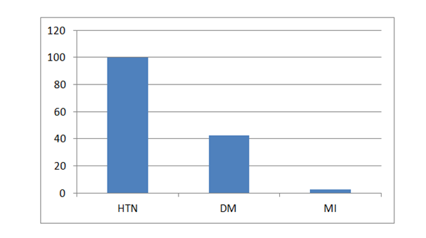 40 patients were considered to observe the relation between hypertension and diabetes mellitus. Report suggested that 40 hypertensive patients there were 18 (45%) with diabetes mellitus (type 1=3, type 2=15) where 80% were found in their family. Diabetes mellitus were noticed higher in male (60%) (Figure 1) where ages from 38-61 years. Only 1 was in myocardial infarction (MI) (Figure 2) and 3 patients were totally dependent on insulin inject (type 1 diabetes). Blood pressure ranges from 130-150 systolic and 88-100 diastolic (Table 1). Between HTN and other diseases the results were insignificant and negatively correlated. In case of age and HTN the result was same. Only between HTN and patients’ family history significant result were found but correlation were negative. Overall result of this observation has mentioned that hypertension has no significant effect on diabetes mellitus (type 1, type 2), myocardial infarction and others. Each patient had very bad food habit, lack of exercise and some showed bad habits (smoking and betel leaf with accessories) and controlled their problems by medications.