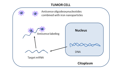 The resistance of tumors to therapeutic intervention is a major problem in the efficacy of treatments. A recent strategy to overcome this problem proposes the association of antitumor drugs with colloidal nanoparticles. Here a hypothesis is suggested concerning the potential use of antisense Oligo Deoxy Nucleotide (ODN) labeled with iron nanoparticles for tumor antisense gene detection with magnetic resonance gene imaging and cancer treatment.